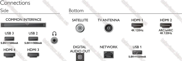 - eARC, Цифровой аудиовыход (оптический), Наушники (разъем 3.5 мм)